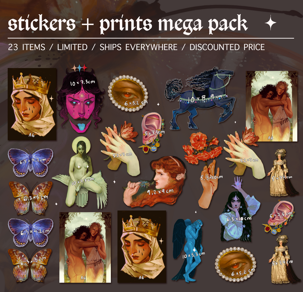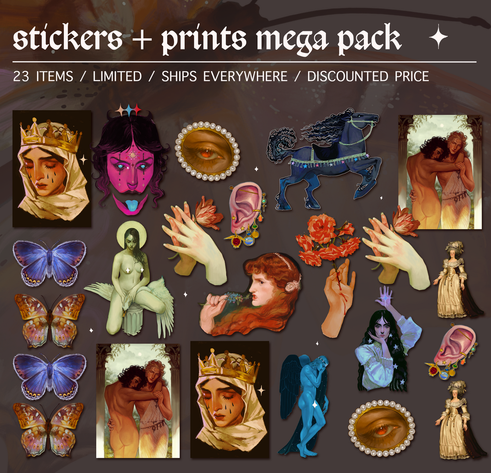 Since I started my physical "The Love Letter" tier on Patreon with stickers and now also prints, I've managed to keep a lot of extra stickers and prints each month that I now want to put together in a little pack for a discounted price. If you've been around and liked my stickers, but missed your chance to procure one, THIS IS YOUR CHANCE! I'll most likely never do a reprint on these babies!